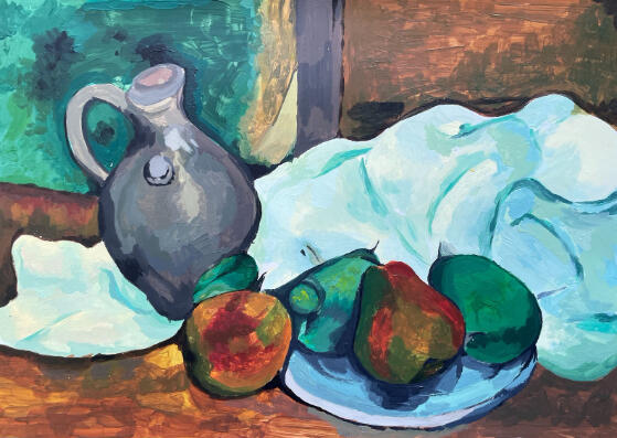 Pintura a tinta acrílica em cartolina duplex A3O objetivo do trabalho foi recriar uma pintura já existente com o objetivo de estudar a cor e as sombras de uma natureza morta.