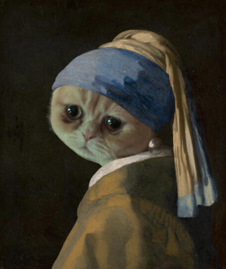 29,7 cm x 42 cm; Edição digitalA artista pretendeu recriar a pintura da Rapariga com o Brinco de Pérola, alterando a aparência da rapariga por uma fotografia de um dos seus gatos, Capitão Iglo.