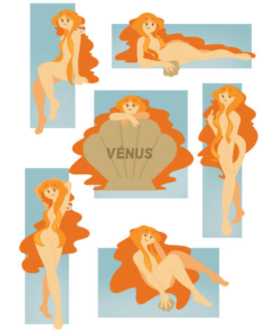 Ilustração digital A4É uma peça recriada a partir de uma obra de Botticelli, Nascimento de Venus. Consiste numa coleção digital de pequenas Vénus que pretende demonstrar os seus lados mais eróticos mas também mais suaves e belos.
